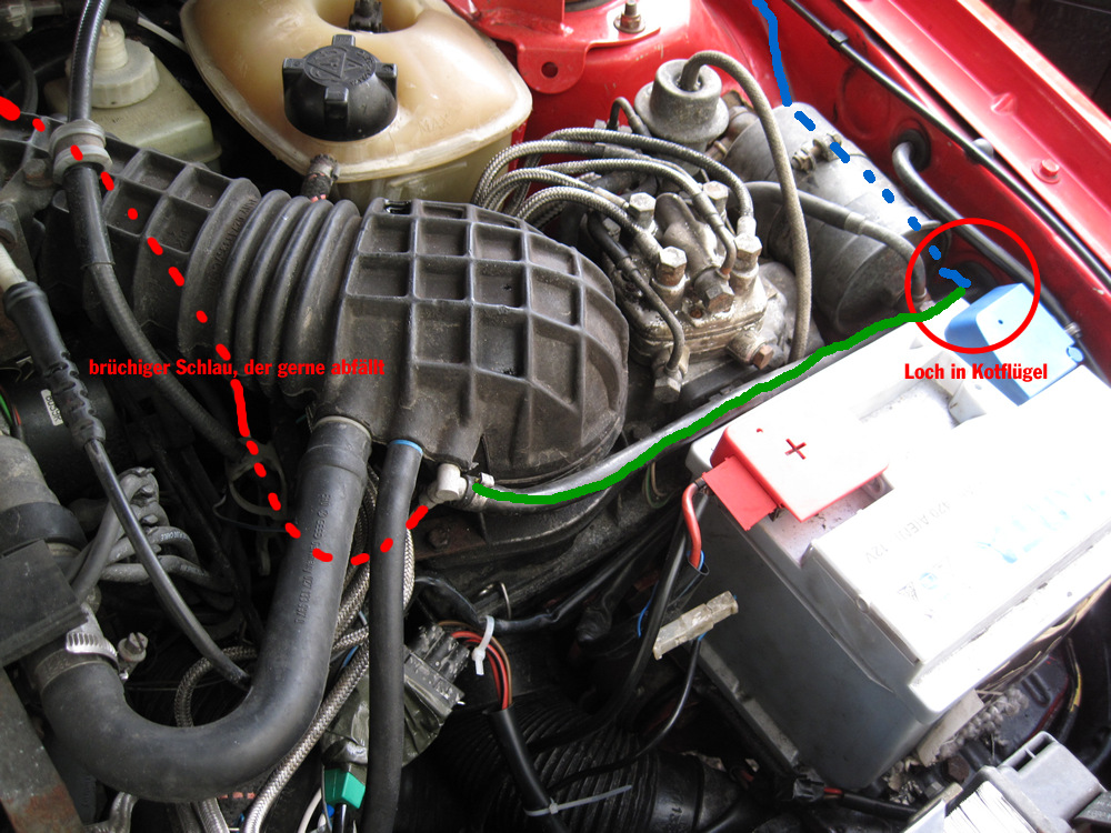 Warum gehen 2 Schläuche ins Loch im Kotflügel zum Kohlefilter? Eine von der Gummihutze, eine von der Drosselklappe.