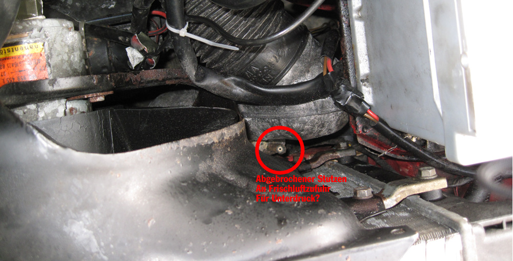 Wofür ist der abgebrochene Stutzen an der Frischluftzufuhr unten am Kühler? Ist das überhaupt für Unterdruckschlauch? Photo von oben und der Seite.