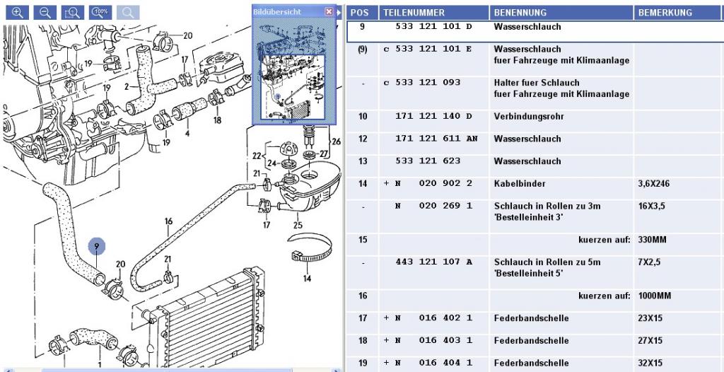 Der Schlauch vom Klima 16V hat an dem Schlauch 9 einen Abgang, wo der Schlauch 16 mit einvulkanisiert ist, der ist im Bild nicht dargestellt, den der Schlauch vom Klima 16V geht seitlich vom Kühler ab.