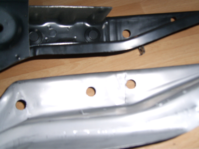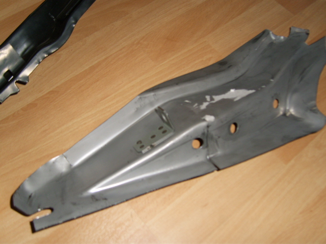 Was ich sagen kann, ist, dass die Bleche zu groß sind, wie gesagt auf die Originalmase gekürzt werden müßten. Nun hängt es auch davon ab, ob es einen zu großen Abstand des U-Profils zur Aussenhaut gibt. Was gut ist, die Bleche sind verzinkt, und vom Material her sogar stärker als die Außenhaut des Originalersatzteils. Schlecht hingegen, dass es, um es in die Form zu pressen, eingeschnitten wurde. Zudem habben die Aufsatzteile an den Bohrungen einen starken Grat. Alles auf den folgenden Bildern sichtbar. Mein Plan, das "Linke" auf das "Rechte" Teil zu legen und entlang anzureissen, wird aufgrund der Form nicht klappen. Also bleibt nur abzumessen.