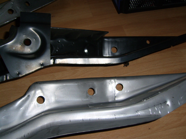 Zu dem Zweck leg ich sie spiegelverkehrt an die Original-Längsträger vorn an und fahre mit der Reißnadel aussen lang. Dann schneid ich das überlappende Blech weg. Ich glaub am wichtigsten ist die Qualität des Bleches und die Blechstärke.