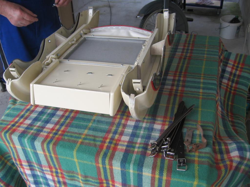 Hier natürlich auch Bilder. Der Buggy wurde erst mal zerleg in einzelteile die Kotflügel sind aus Dicker Presspappe die Metallteile alle Verrostet also schleifen, polieren und neu Verchromen. bei den Kotflügeln erst Spachteln, Füllern Schleifen,Lackieren.Der Sitz musste auch neu mit Leder bezogen werden und natürlich das Rote Kötterband mit eingearbeitet werden.
