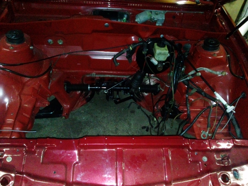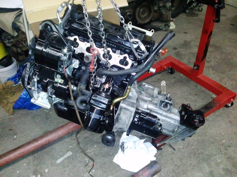 Letzte Woche hab ich schon mal den Motor rein gehoben. Komplett mit Getriebe und allen Bauteilen, ganz schön eng, aber machbar.