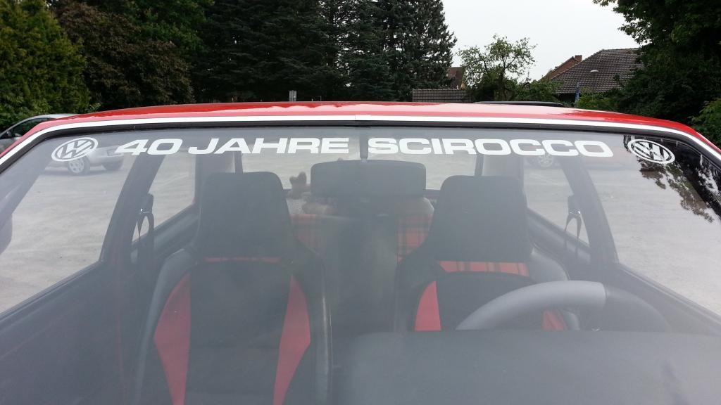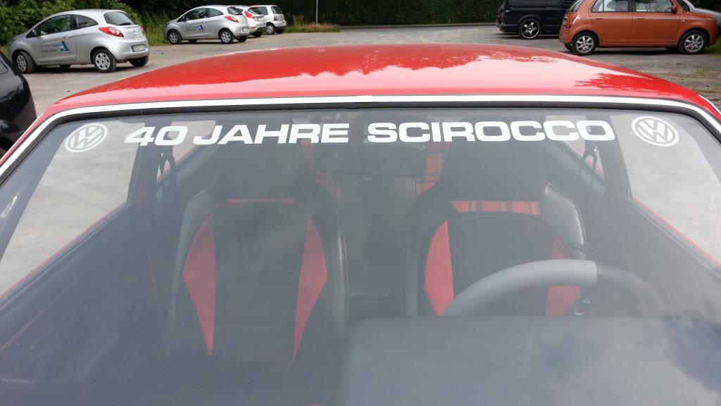 Ich könnte dann Scheiben-Aufkleber mit dem Schriftzug VW 40 Jahre SCIROCCO VW mitbringen.