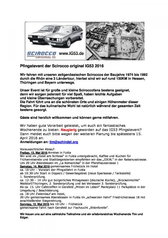 Gude - es ist für den Ein oder Anderen vielleicht eine interessante Sache, darum setz ich´s mal hier rein. Die Jungs von der Scirocco original IG veranstalten wieder ihre alljährliche Pfingstfahrt. Diesmal geht es nach Fulda und in die Rhön. Alles weitere seht ihr auf dem Flyer.