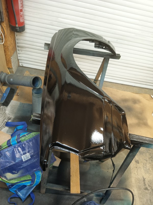 Inzwischen ist es draussen wärmer geworden. Daher konnte ich nun endlich mit der Lackierung weiter machen. Die Kotflügel sind soweit durch. Gleichwohl werde ich die Einschlüsse bzw den Klarlack an sich, genau wie am Dach, noch einmal fein anschleifen und dann nochmal dünn Klarlack aufziehen. Es soll aber erstmal so 2-4 Wochen durchhärten. Glatt ists aber dank Mipa cc8 schon so geworden.