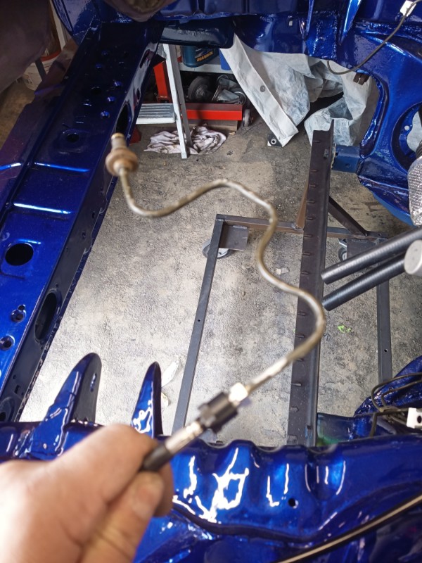 Hier jetzt mit der endgültigen Lösung mittels eines angefertigten (Brems-)Schlauches der Firma Probrake. Kostenpunkt für 105cm Schlauchlänge ca 55 Euro mit Versand. Der Vorteil hier ist, dass das Ganze insgesamt etwas flexibler ist. Man kann den Geberzylinder im Bedarfsfall mit wenig Aufwand demontieren, ohne die ganzen starren Leitungen abbauen zu müssen.