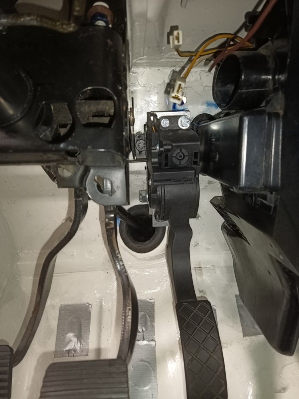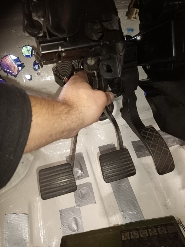 Hier sieht man, dass die Pedale alle halbwegs auf gleicher Höhe sitzen werden. Das Bremspedal halte ich mit der Hand fest, weil noch kein Bolzen in der Verbindung zu BKV steckt.