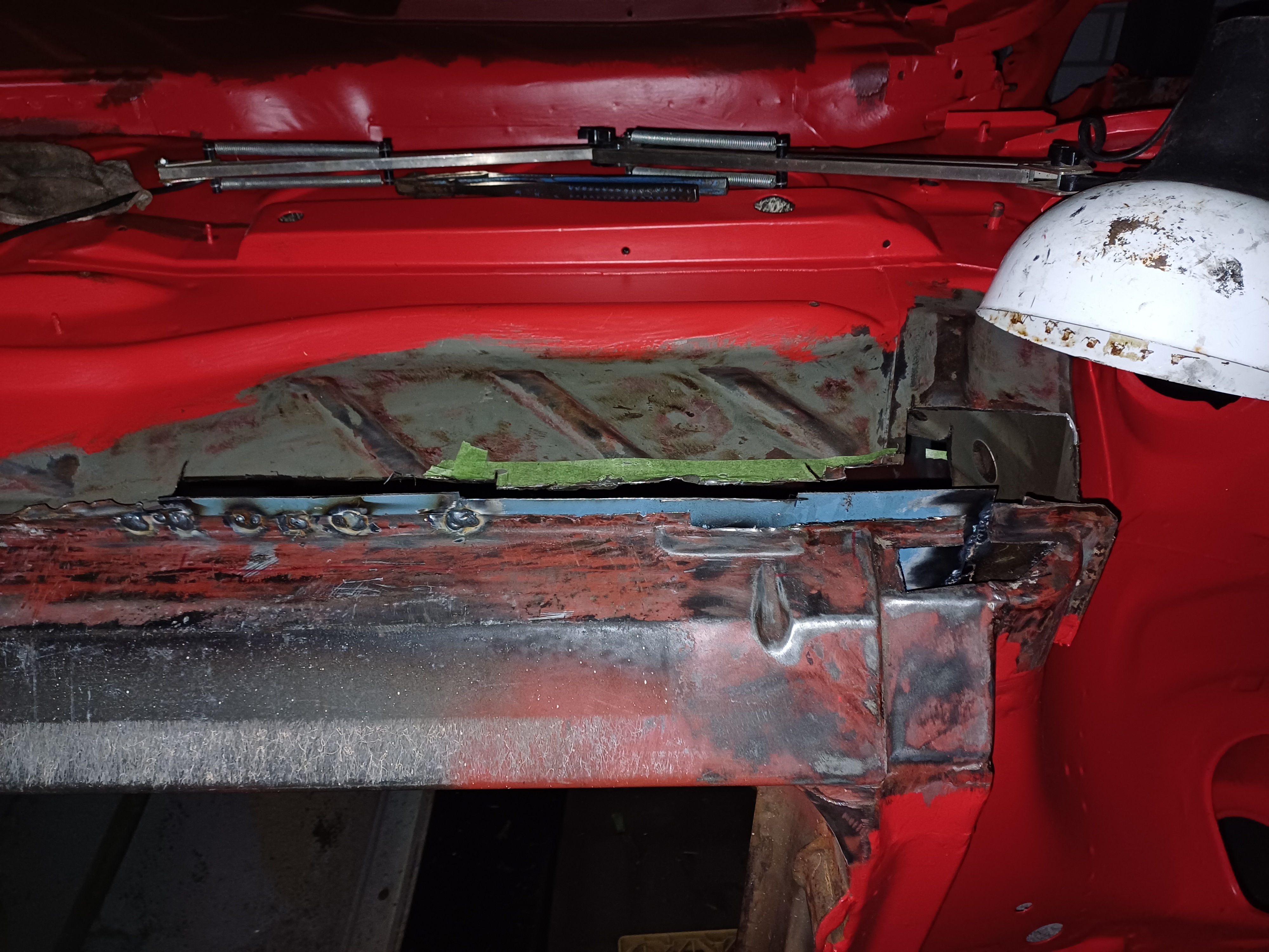 Konnte jetzt kein weiteres Verstärkungsblech vorne finden weder Links noch Rechts und die Innenschweller sind noch original.