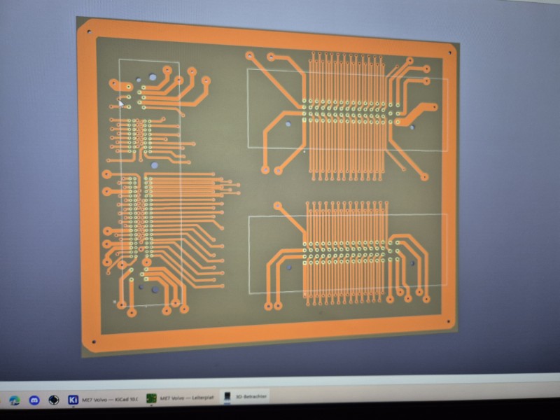 Was sieht man da: also es ist ja zunächst ein Versuch... Von links kommt der Stecker der ME in die Buchse, die sich sonst am Steuergerät befindet. Rechts kommen 2 Buchen auf die Platine, die sich sonst in Steuergeräten von Volvo finden. Der neue, verlängernde Kabelbaum beginnt also mit 2 62Pin Volvosteckern. Dann kommt der laaaange Kabelbaum, gebaut und geschirmt wie Serie. Irgendwann, vielleicht so nach 2m, folgt der neue (Serien-)Stecker fürs Motorsteuergerät.