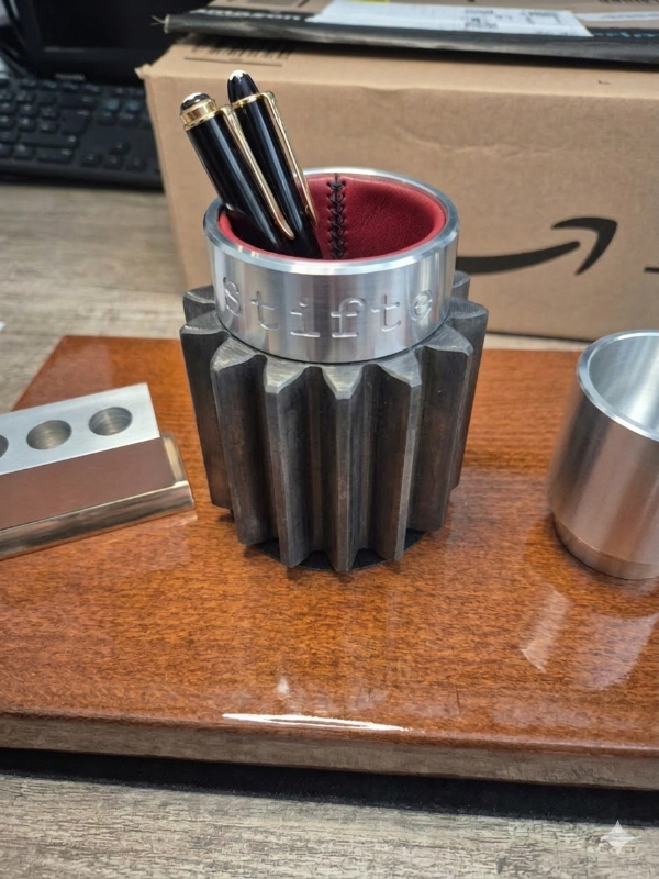 Das Ding ist aus Buche, 27mm dick. Drunter rutschfeste Füße aus Alu mit O-Ring als Antirutsch. Das Zahnrad stammt vom Unimog. Musste ich weich glühen, weil war gehärtet. Den Stifteeinsatz hab ich aus PETG gedruckt, konnte es nicht tief genug ausdrehen. Vlt kommt der Einsatz nochmal aus Alu, mal sehen. Der kleine Stiftehalter links ist aus einem Reststück 5083 Alu mit poliertem Messing drunter. Rechts der Becher für Büroklammern ist aus 7075 Alu, hochglanzgedreht, mit einem Fuß aus poliertem Messing.