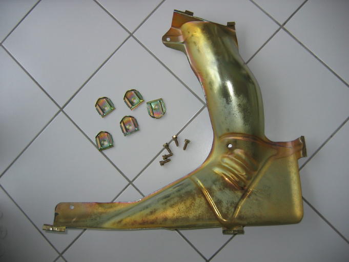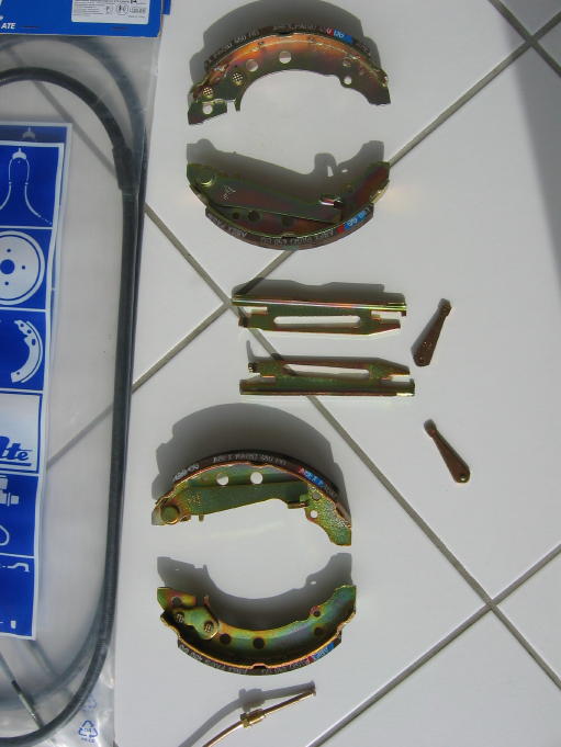 Nach drei Wochen sind die Teile vom Gelbchromatieren zurückgekommen. In der Zwischenzeit hatte ich für die Hinterachse je 2 neue Radbremszylinder, Bremsseile und Bremsschläuche besorgt. Und auch einen Satz Bremsbeläge für die Backen zum Aufnieten. Mein Stammteilebesteller meinte beim Ausliefern (hatte er ausnahmsweise nicht bestellt), daß hier wohl was verkehrt sei :-) ). Gab ein großes Hallo als ich in der Werkstatt die Beläge mit der Zange, die dort an einem Stahlträger montiert ist, aufgenietet habe.