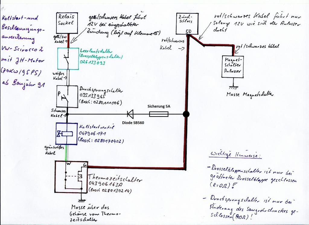 Was mir zudem rätselhaft scheint, ist der Umstand, dass ich das Kaltstartventil mit dem drehen des Anlasser ja durch direkte Verkabelung hinbekommen habe. Allerdings erscheint mir der Zeitraum einfach zu lang. Das Relais sollte den Einspritzvorgang max. 1-2 Sekunden gestatten, da der Wagen sonst wirklich zu fett läuft und wie auf dem Video zu sehen, ja auch fast ausgeht.