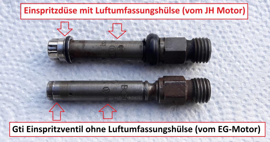 Welche Einspritzventile hast du damals genau genommen? Hast du zufällig noch die Bosch Teilenummer? Die Einpritzventile vom Gti haben doch keine Luftumfassungshülse wie die vom JH. (siehe Bild) Hast du die Ventile ohne die Luftumfassungshülse eingebaut oder hast du die Hülse umgesteckt?