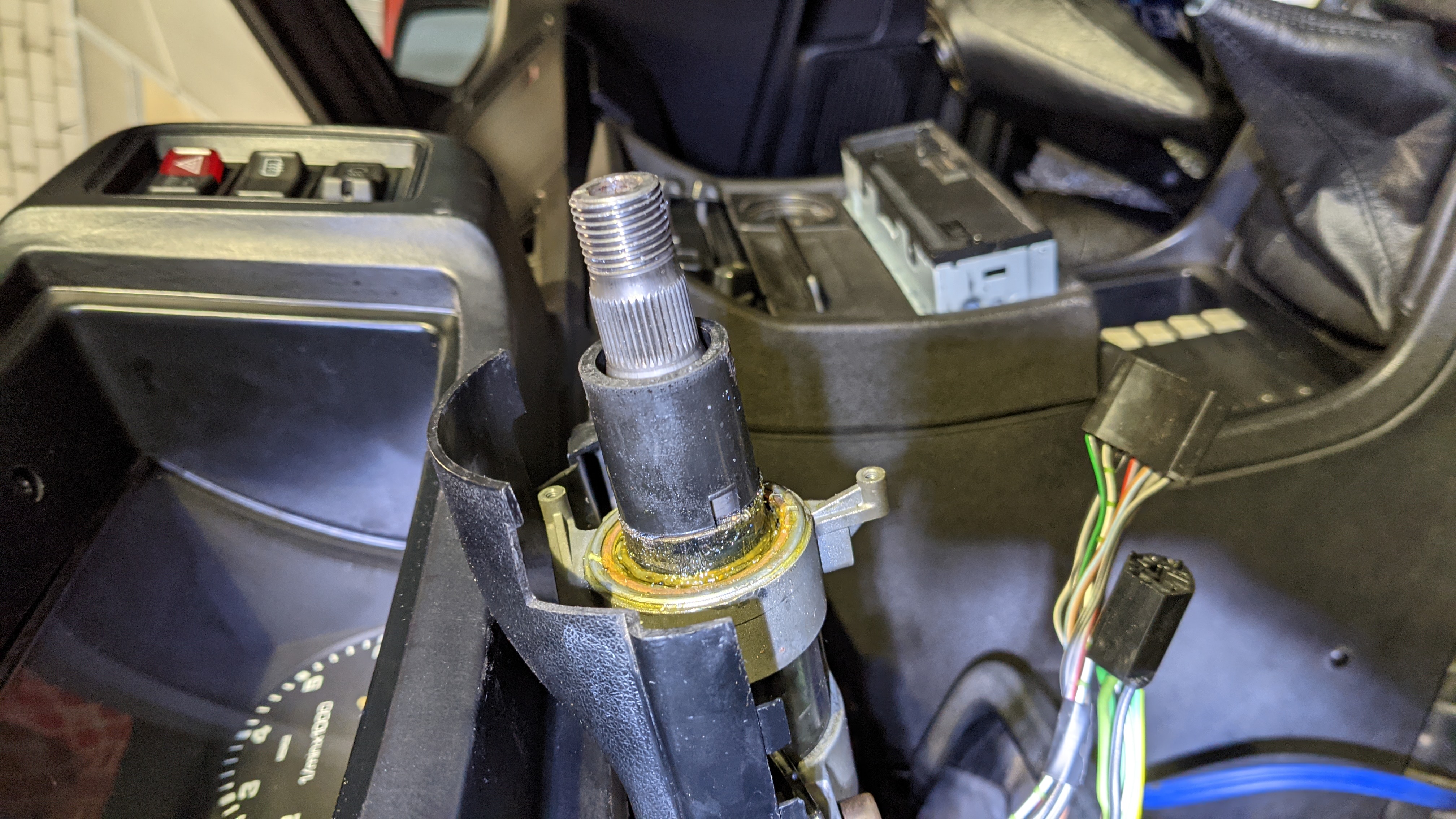 Den 2. Distanzring entfernt, danach gesehen, dass das Kugellager vom Zündschloss neues Fett Verträgen könnte, also ausgebaut. Dabei im übrigen festgestellt, dass das Adapterstück welches von hinten in das Zylinderschloss greift völlig abgenutzt war. Glücklicherweise hatte ich dieses ja noch mitbestellt (171419341). Also alles sauber gemacht, neues Fett rein und den weißen Distanzring eingesetzt. Passte alles wunderbar und die Lenksäule hat jetzt auch viel weniger Spiel wie vorher. Also alles wieder zusammengebaut und die neue schwarze Distanzhülse aufgesetzt, Originale Blinker- und Wischerhebel montiert, Lenkrad drauf und es klappt alles ohne Hupen B-)
