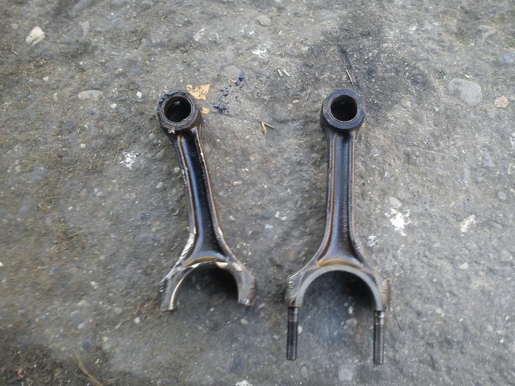 Heut hab ich den alten Motor noch vollends zerlegt. Ergebnis: Nebenwelle sogar in 4 Teile zerbrochen, Kolben vom betroffenen Zylinder gerissen und Pleuel verbogen. Außerdem hatten selbst die anderen 3 Kolben schon Schleifspuren. Scheinbar hatten die auch schon recht viel Kippspiel, ließen sich im OT auch schon etwas kippeln.