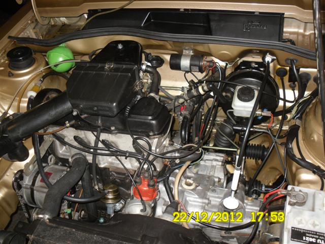 Im Motorraum wurden paar Blechteile in "schwarz Samtmatt" nachlackiert, der Motorblock nachlackiert, alle Anbauteile ausgebaut und gereinigt, der Zahnriemen mit Spannrolle gewechselt, der Vergaser gereinigt, alle Unterdruckschläuche ersetzt sowie Luftfilter und Keilriemen getauscht. Das Kühlwasser wurde abgelassen, der Kreislauf mehrfach gespült und wieder frisch aufgefüllt. Die Spritschläuche wurden auch ersetzt. Das Motorlager rechts am Block ist schon getauscht, die anderen drei folgen in den nächsten Tagen.