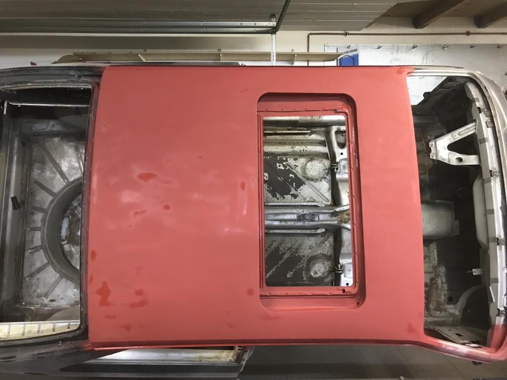 Das Dach habe ich von Spachtel befreit und die Löcher des Dachspoilers sind wieder zu. Ich muss mir einen Blechzauberer suchen, der mit dem Brenner alles glatt richten kann. Ich möchte zukünftig keine 5mm Spachtelnasse auf dem Dach haben.