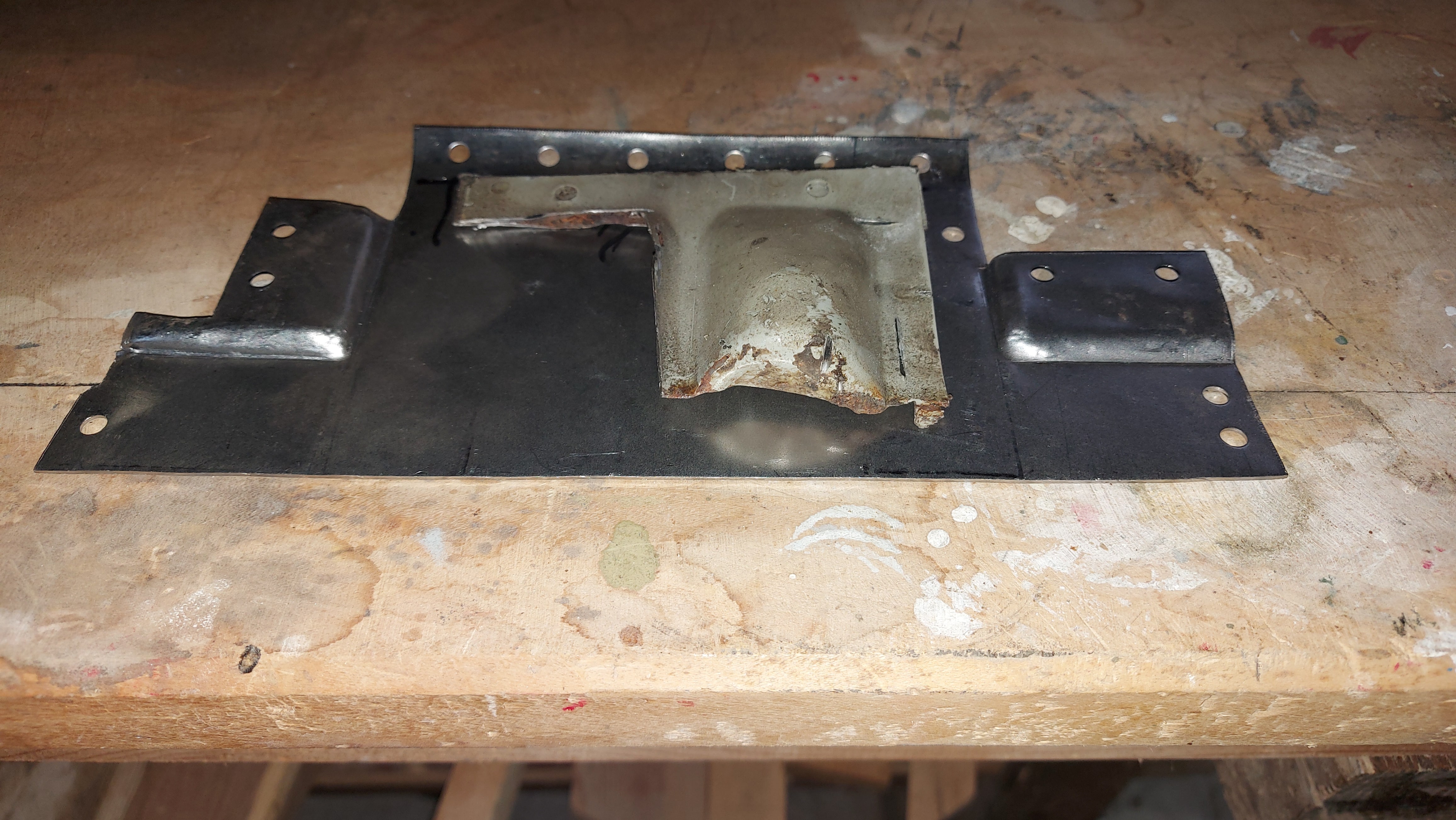 Hab ein Rep. Blech für den Innenschweller vorne links angefertigt und jetzt müsste eigenlich diese Blech mit den beiden Erhebungen dran.