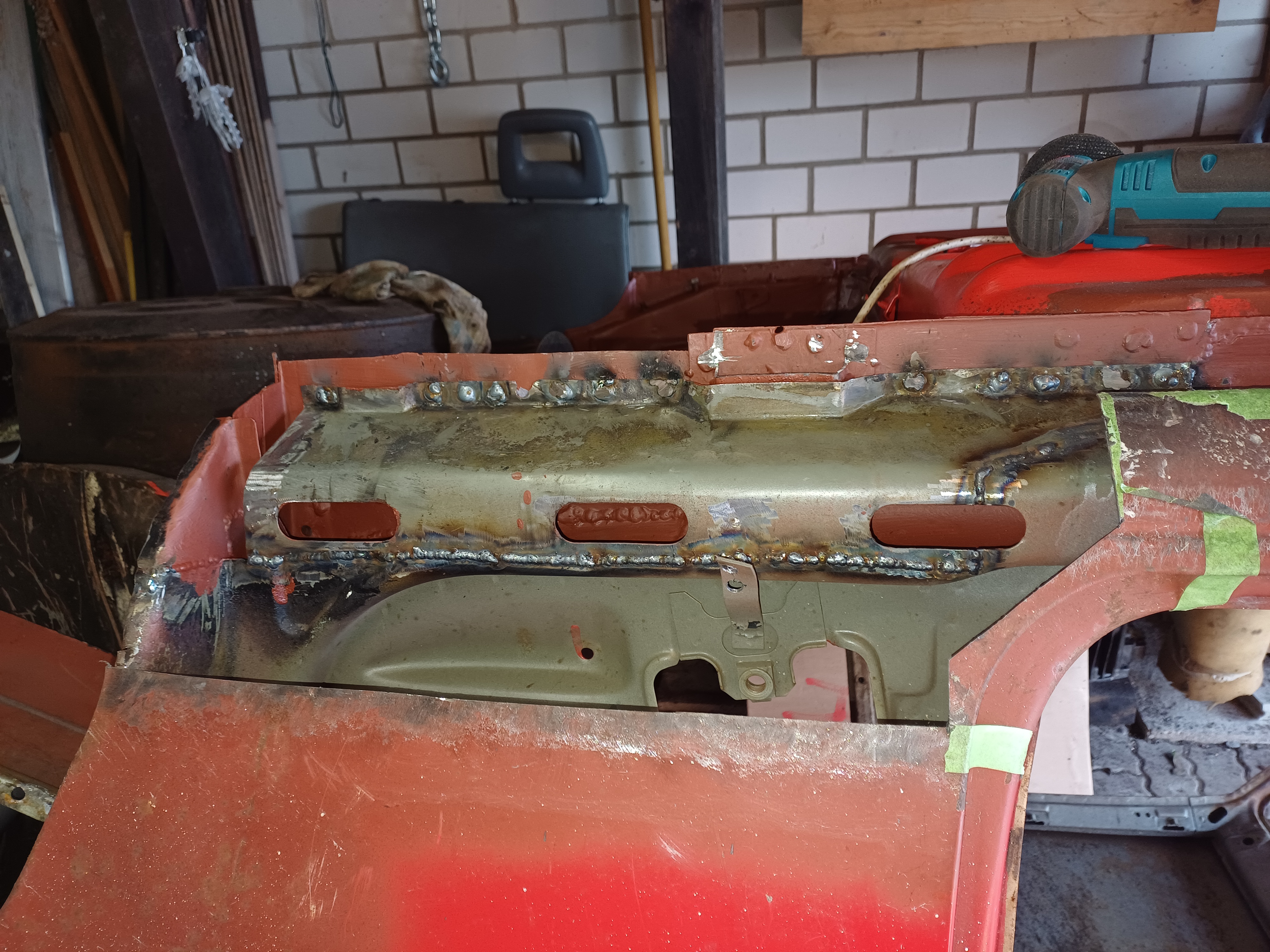 Das hab ich von innen soweit es geht entrostet so gut es ging und eine Verstärkung gebastelt für die Wagenheberaufnahme.