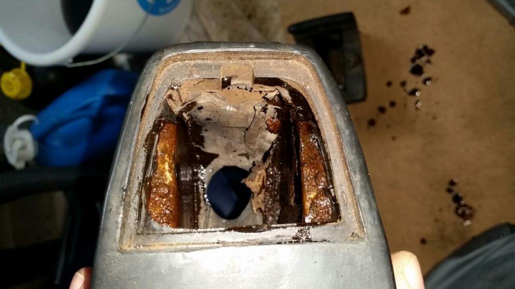 Sonntag abend habe ich mal schnell den rechten SWRA Höcker restauriert, sind ja beide ziemlich verrottet, aber beim rechten fehlte das Blech oben komplett, wo die Düse durchgesteckt wird. Also hab ich das Blech oben neu gebaut und eingeklebt, nachdem ich vorher beide Höcker in Fetan ersäuft habe.