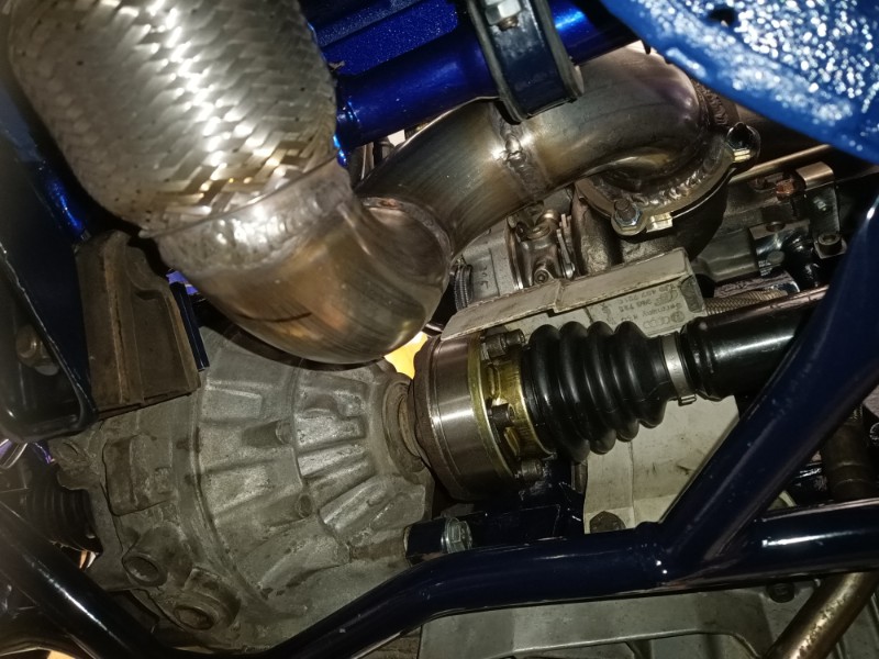 Am MSD/VSD ist der Übergang von 70mm auf 63,5mm zu sehen. Das Problem ist nun, dass dieses lange Rohr so nicht insgesamt über die Hinterachse zu schieben geht, die Achse müsste abgelassen werden. Für Reparaturzwecke ist mir das aber zu dumm. Daher werde ich hier entweder noch eine V-Band Schelle irgendwo unterm Tank einschweißen oder einen Rohrverbinder setzen. Weis ich noch nicht so genau. Ergibt sich dann.