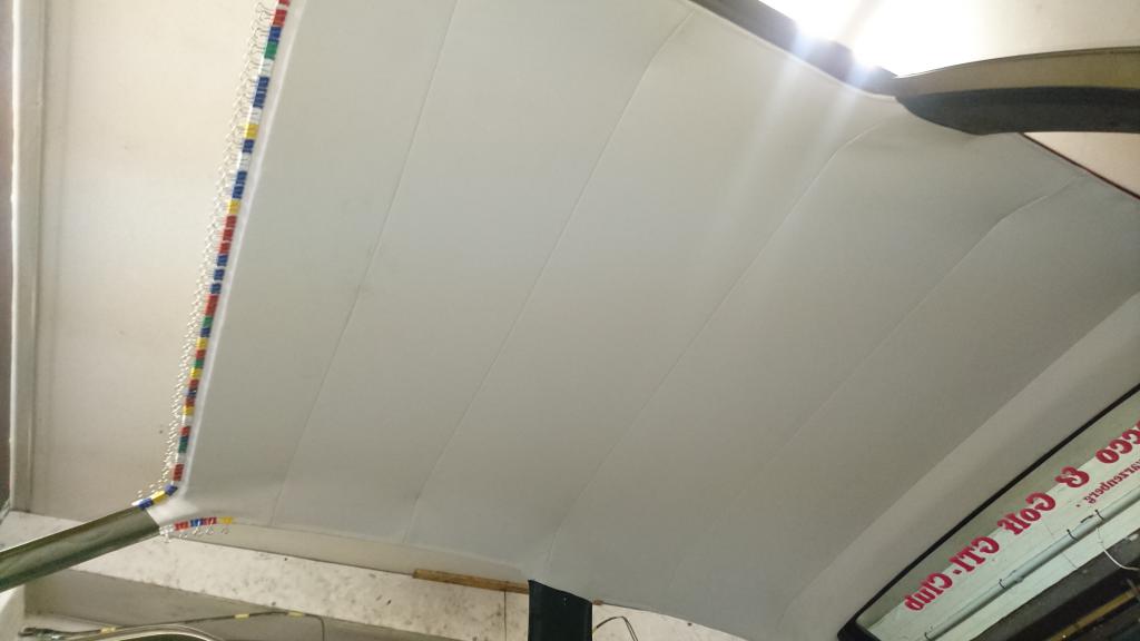ertshabe ich die ganzen stangen eingehängt und schon mal paar Tage gespannt und dann zuerst hinten verklebt und danach von hinten nach vorn dabei richtig spannen sonst bekommt man die Falten vorn nicht mehr raus, zu Schluss die Kante vorn verkleben