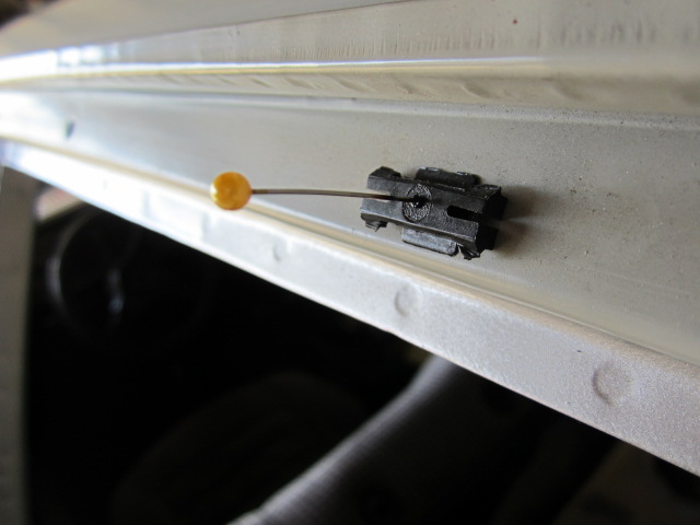 Außerdem habe ich die Klipse der Seitenleiste ausgebaut. Da diese mittlerweile in Gold aufgewogen werden, habe ich den Arretierstift mit einer heißen Naden fixiert und an einen Bindfaden gebunden, um diesen aus dem Hohlraum wieder herraus zu bekommen.