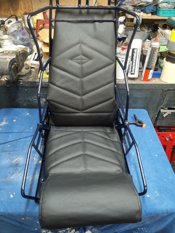 Leider sieht man oben, unterhalb der Gurtdurchführung am Kopfende die Spannklammern durchschimmern. Das ist ärgerlich. An den Flanken im Schulterbereich ist etwas zu viel Material, trotz genauer Übernahme des vorherigen Bezuges, der gut saß. Ärgerlich, aber nicht zu ändern. Mal sehen, wie das beim zweiten Sitz aussieht. Außerdem musste ich im Schulterbereich etwas per Hand nachnähen, was bei dem vorherigen Bezug nicht vernäht war, hier aber sein muss, damit man die blaue Polsterung nicht sieht. Egal. Das sind so die Kleinigkeiten die mich ärgern.