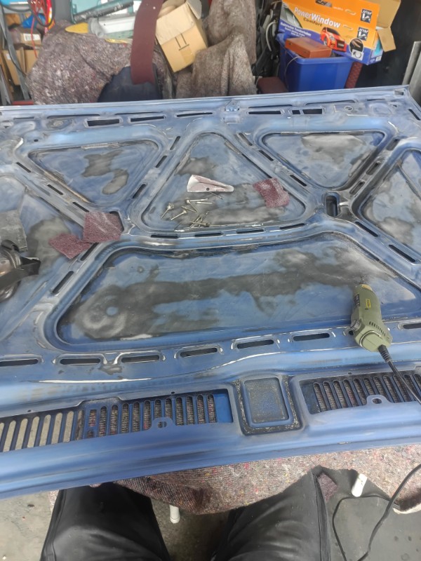 Motorhaube innen sauber schleifen ist echt ne Arbeit für Leute, die die eigenen Eltern usw..., naja, sagen wir mal, es macht keinen Spaß. Aber was solls. Muss auch sein.