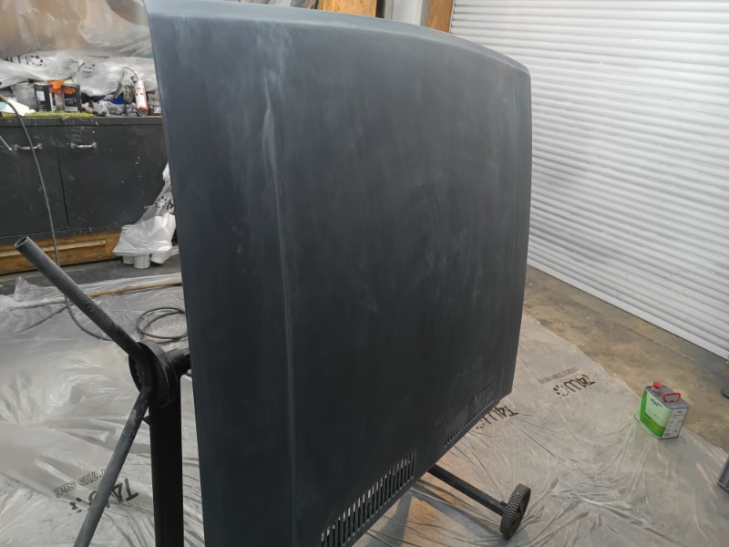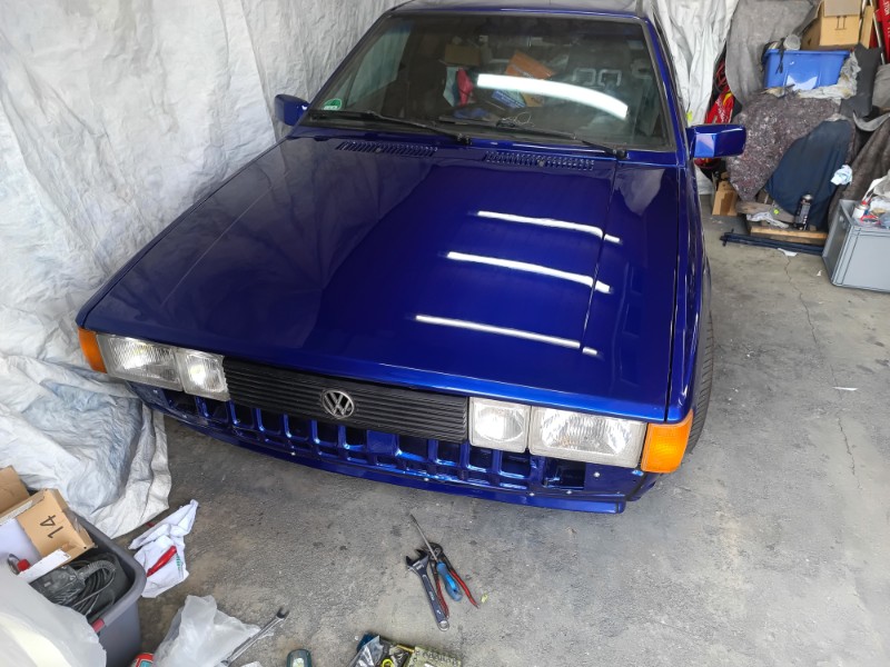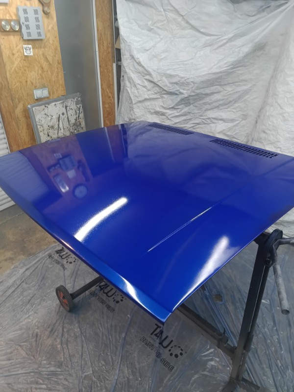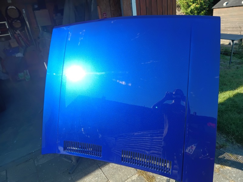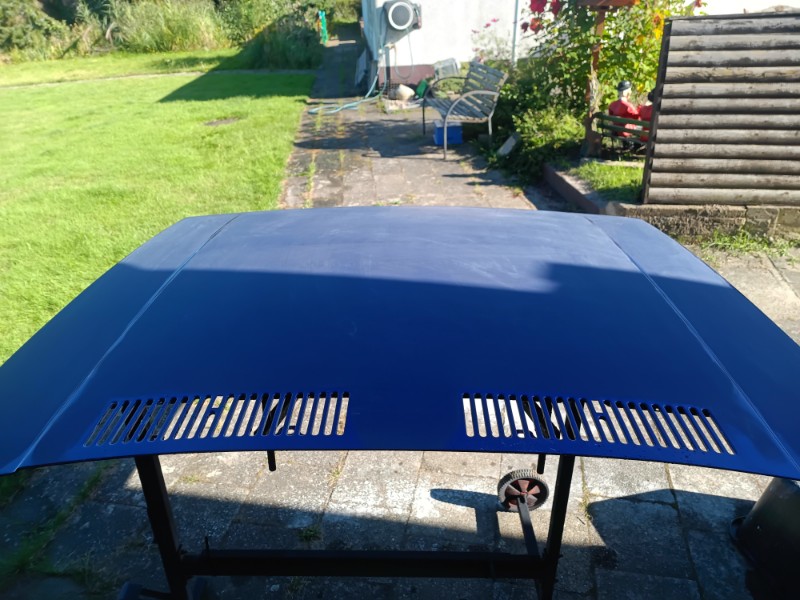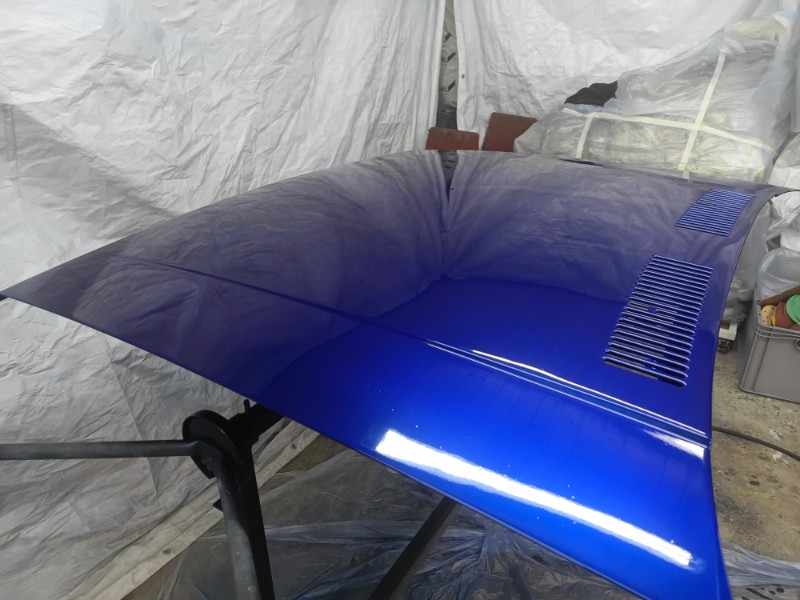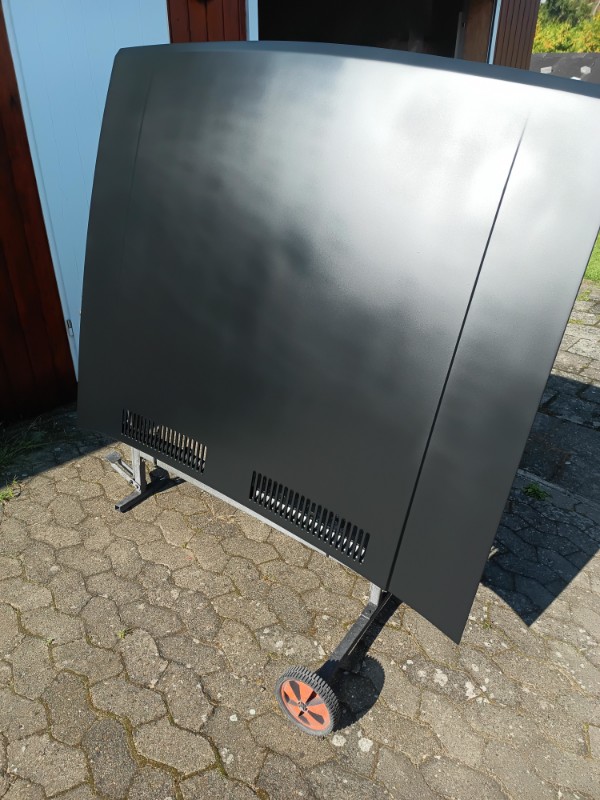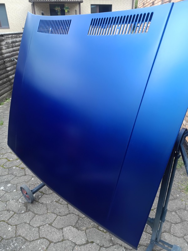 Motorhaube war ja grundiert und gefillert. Anschließend würde sie mit 320er mit exzenter Schleifmaschine glatt geschliffen , danach noch ein Durchgang mit 500er.