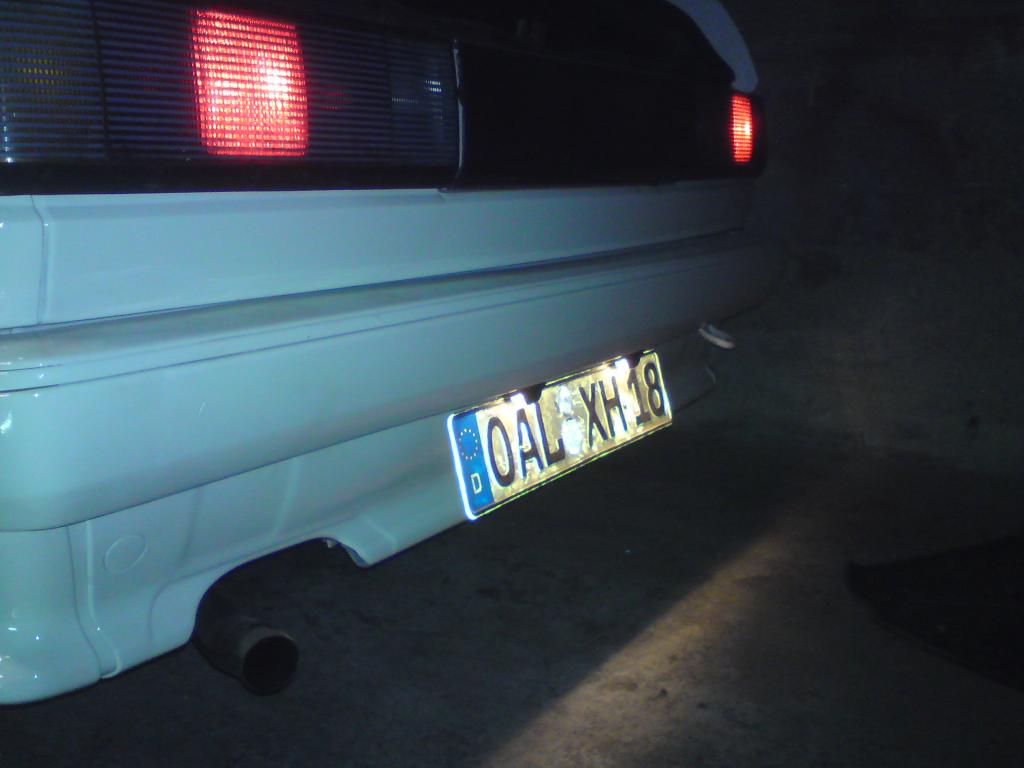 Ich hab dann in die Stossstange ne passende Aussparrung ins Plastik geschnitten und zur Befestigung 2 Löcher gebohrt, über die ich dann Blechmuttern gesteckt hab. Nur im Plastik hätten die Schrauben net lang gehalten. Für das Nummernschild selber hab ich ganz einfach 2 Blechstreifen an den Stossstangenträger geschraub, fertig. Für die Stromversorgung hab ich einfach nen Heckklappenkabelbaum hergenommen und einfach angesteckt und den Masseschuh noch auf den Stossstangenträger mit drauf verschraubt und siehe da! Licht is da!