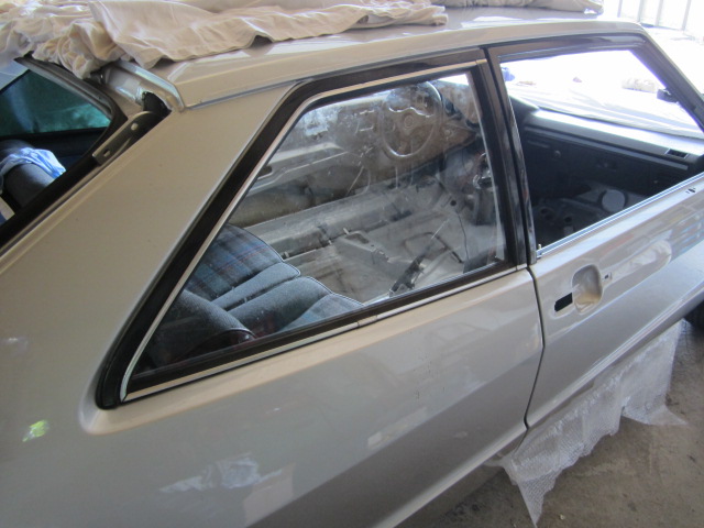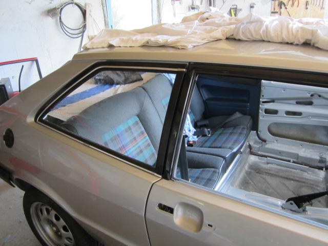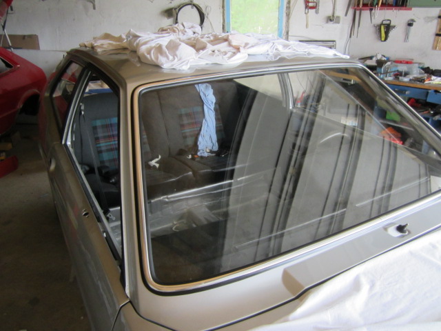 Dies erschien mir die sicherste Art des Ausbaus. Danach sauber gemacht, die Blechkante am Auto mit etwas TimMax bestrichen und die Scheibe in der "Rohkarosse" wieder eingezogen.
