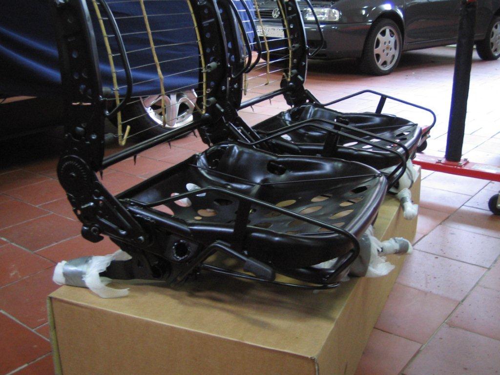 So am Freitag hab ich die Sitzgestelle vom Beschichter geholt, hab dann auch gleich die Mechanik der Höhen- und Lehnenverstellungen wieder gängig gemacht und die Gestelle wieder wieder soweit zusammen gebaut wie ich sie vom Sattler bekommen hatte. Heute dann beim Galvaniker die aufbereiteten Halter für die Kopfstützen und beim Freundlichen die Kunstoffteile für die Sitze geholt und alles zum Sattler gebracht.
