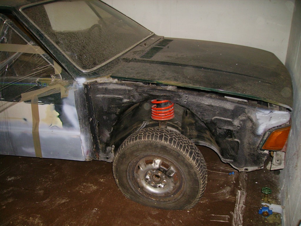 Das Fahrzeug war wohl mal ein Breitbau, wie man an den Aufsätzen an Türen und Seitenteilen sowie der völlig verschraddelten Stoßstange noch erkennen kann.