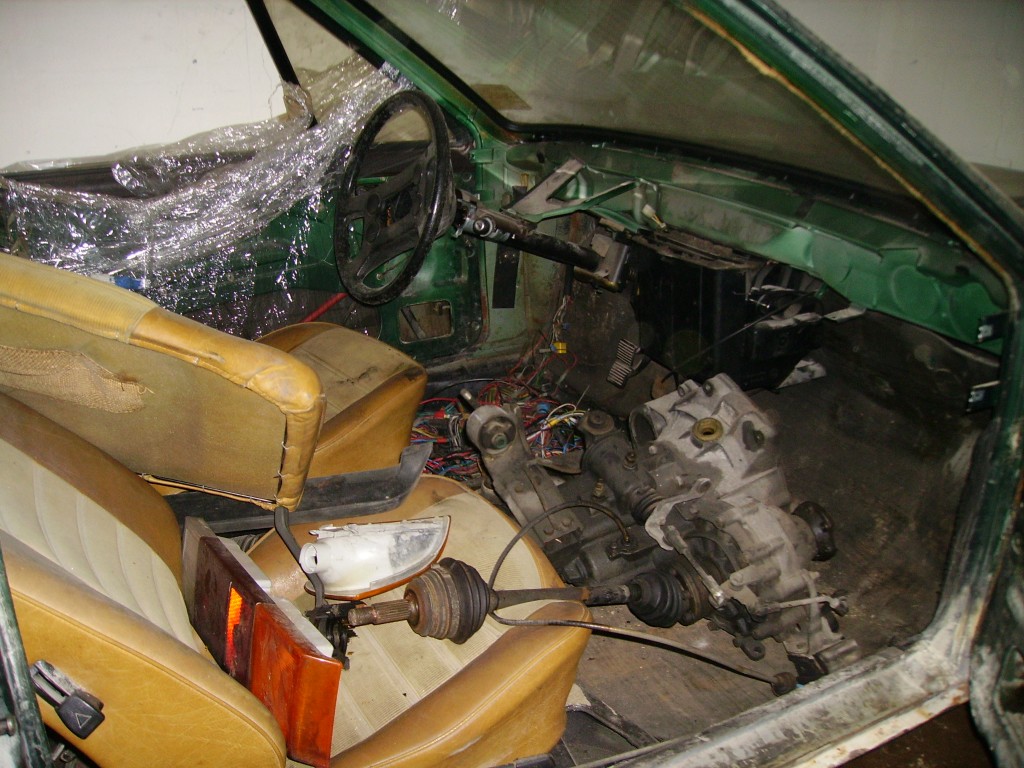 Alles, was auf den Bildern zu sehen ist, d.h.: Fahrzeug, Motor (ausgebaut im Kofferraum mit Krümmer), Getriebe (liebevoll im Beifahrerfußraum). Mengenteiler und ein Ersatzteil sind auch noch dabei. Die Stoßstange vorne (auch ein Breitbau-Spoiler-Monster). Teile der Innenausstattung.