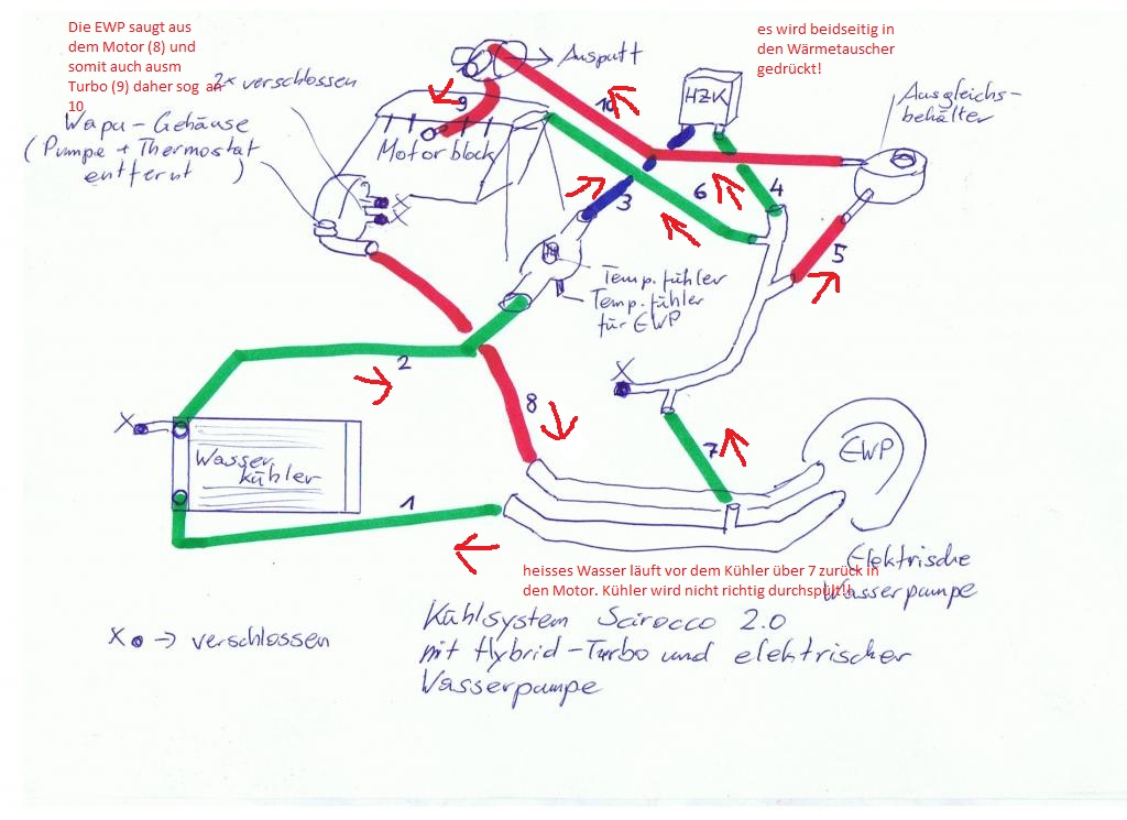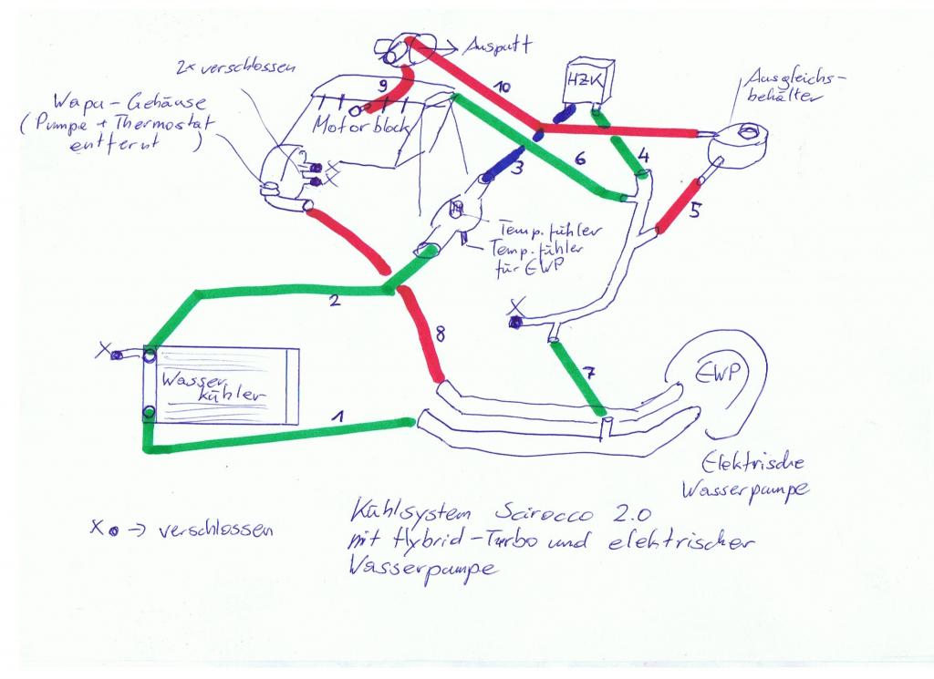 Ist ne Menge Wasser was da bewegt werden will, da bin ich mir net ganz so sicher das das deine EWP so allein schafft. Bau die Mechanische wieder ein und ergänze wie im Bild den Turbokühlkreislauf mit der EWP.