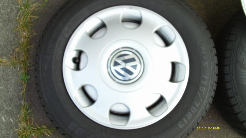 4x 13"Stahlfelge mit VW Lupo Radkappen. Winterreifen (175/70 R13) sind alt und müssten erneuert werden.