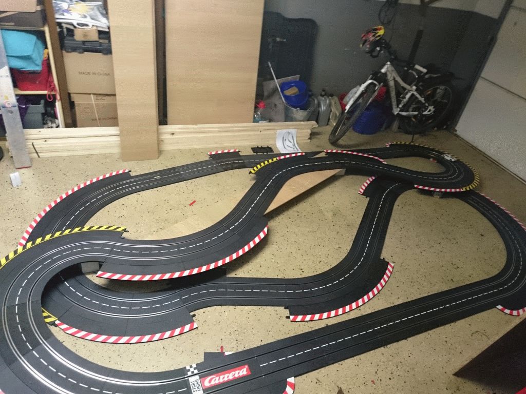 Seit Anfang des Jahres habe ich mir einen "kleine" Carrerabahn (4x2m, knappe 17m Schienenlänge) in die Garage gebaut.