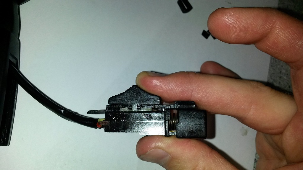 Laßt nach Möglichkeit den weißen Einsatz im Gehäuse drin, dies sind zwei Einzelteile mit einer Feder im inneren. Es ist fummelig und erfordert einen Miniturschraubendreher umd die Feder wieder einzuspannen wenn das auseinander geht. Sollte er auseinander gehen, auf dem vorrigen Bild sieht man wo der weiße Stift rausschauen muß, sonst bastelt ihr zweimal:
