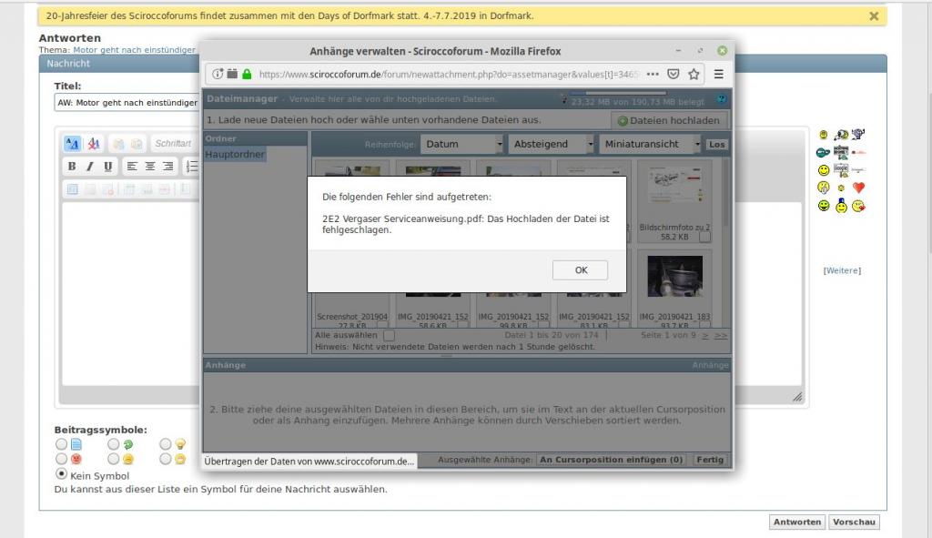 Sorry, aber funktioniert leider nicht oder ich krieg's nicht auf die Kette. Wenn ich auf Anhänge klicke, die Dateien dann hinzufüge, werden diese mit einem Ausrufezeichen dahinter angezeigt und ein Upload geht leider nicht.