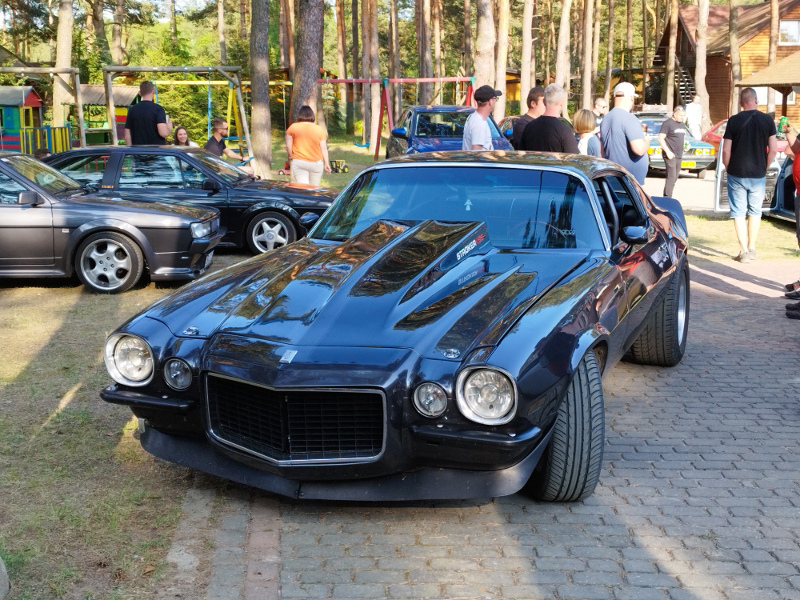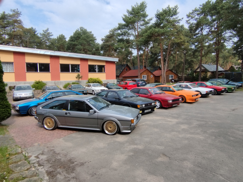 Es beginnt am Dienstag, Sonntag ist der Ausklang. Das reicht manchem Teilnehmer noch nicht: Zehn 53er sind bereits am Montag eingetroffen und glänzen zwischen festen Unterkünften, Wald und See in der Sonne, die das komplette Treffen begleitet hat. Daran hat auch der blitzartig vollautomatisch arbeitende Scirocco-Regenschirm - teils in Wagenfarbe - als Begrüßungsgeschenk nichts geändert; aber auch als Sonnenschirm ist er willkommen. Das T-Shirt zur Begrüßung weist auf das 13. Sciroccotreffen in Polen hin, was 2023 im Heiligkreuzgebirge stattfindet. So geht es im Sciroccokonvoi mit rund 30 Karmännern steigungs- und kurvenreich am Mittwoch zur Kartbahn, wo wir erfahren können, wie sich ein wirklich hartes Fahrwerk anfühlt. Auch einer der beiden Wachhunde, die dem Treffen die gebotene Sicherheit verliehen haben, traut sich ans Steuer. Obwohl in den in Summe 180 Euro Eintritte, knapp sechsstündige Kartbahnnutzung und sämtliche Übernachtungen in festen Häusern sowie das jeweils durch verschiedene Blechkuchensorten und landestypische heiße Suppen bereicherte Frühstück und Abendessen enthalten sind, servieren die Kartbahnmanager den Sciroccofans zum Mittag unentgeltlich ein kaltes Buffet, Getränke und Knabbereien.
