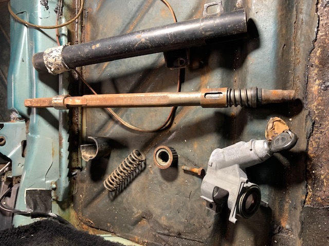 Frage Nummer 1.... Das sind alle Teile die von der Lenkung vorhanden sind. Gefühlt ist das ganze zu kurz um es unten mit der Gelenkwelle am Lenkgetriebe zu verbinden wenn man das Mantelrohr montiert. Fehlt da was? Für die Lange Feder finde ich keinen Platz.