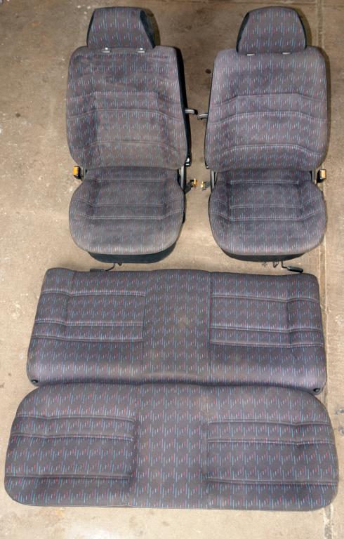 (3) Sitzgarnitur, 3-Türer: Fahrer- und Beifahrersitz + Rückbank. Guter Zustand. Keine Löcher oder Risse im Stoff, Klappmechanismus ist voll funktionstüchtig. Garnitur stammt aus einem Nichtraucherfahrzeug. 99Euro