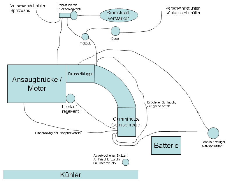 bei mir sind auch nur drei schläuche am dom über der stauscheibe. bei dir geht aber einer von der drosselklappe zum anschluss an der stauscheibe laut deiner zeichnung. welchen sinn sollte das machen? der gehört glaube an das ding unten am kühler wo bei dir was "abgebrochen" ist. sehe auf dem foto aber auch nur 3 bei dir.