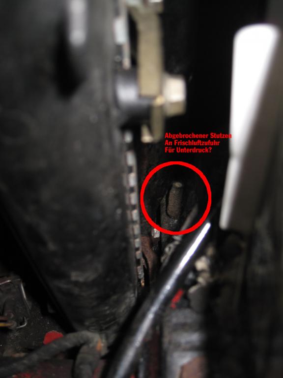 Wofür ist der abgebrochene Stutzen an der Frischluftzufuhr unten am Kühler? Ist das überhaupt für Unterdruckschlauch? Photo von oben und der Seite.