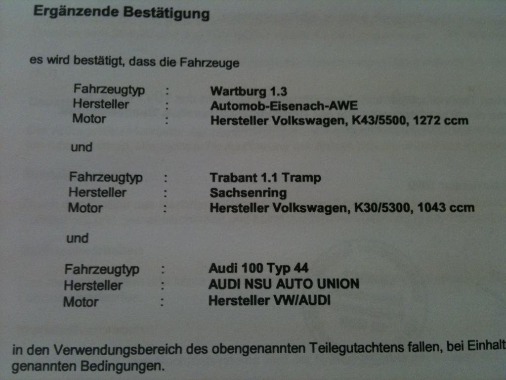 Außerdem umrüstbar: Trabant und Wartburg Motoren (siehe Foto vom Gutachten)