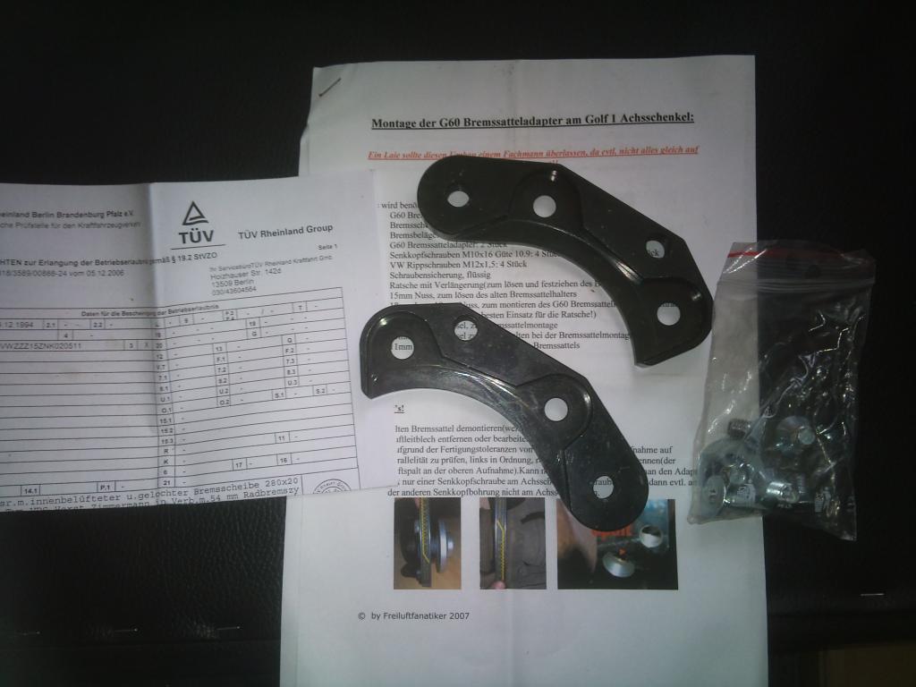 3.) -verkauft- G60 Bremsscheibenadapter. Diese stammen vom "Freiluftfanatiker" aus dem Golf 1 Forum. Kaufpreis weis ich nicht mehr genau, glaube so bei 120 Euro. Habe diese Adapter vor 3 Jahren gekauft und seitdem lagen sie nur herum. Da ich jetzt eine K-Sport Bremse verbaue, werden diese Adapter auch niemals verwendet werden. Ich schicke die Sachen, die auf dem Bild zu sehen sind, zu. Das müßten auch alle Teile sein, die zum Set gehören. Es ist eine Einbauanleitung, ein Materialgutachten und noch irgendwas für den Tüv dabei. Genaueres kann ich dazu nicht sagen und müßte vom Käufer direkt beim Freiluftfanatiker erfragt werden. Habe die Teile lediglich mal in der Werkstatt an einem Achschenkel im Schraubstock montiert gehabt. Ich hätte für dieses Set gerne 50 Euro.
