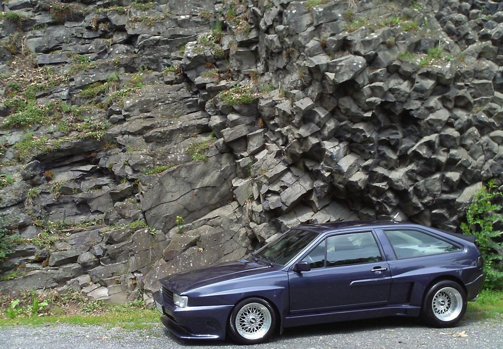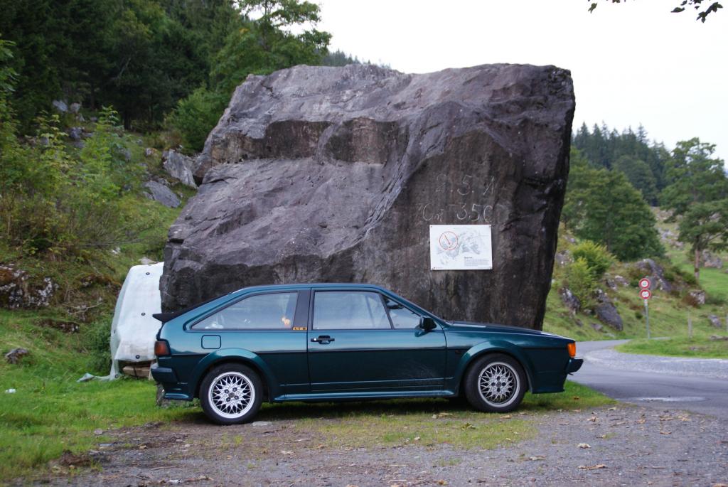 Scirocco mit Stein/Fels Das Steinchen muß 1974 vom Berg abgegangen sein und ist dort einfach liegen geblieben, scheinbar soll das Ding 350 Tonnen wiegen.