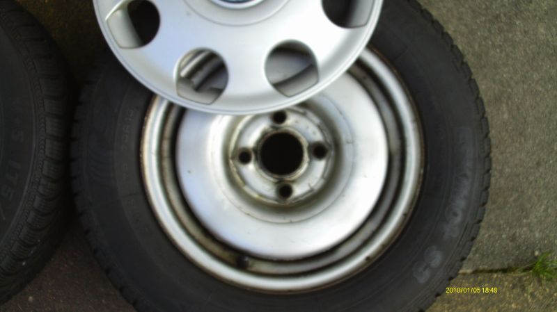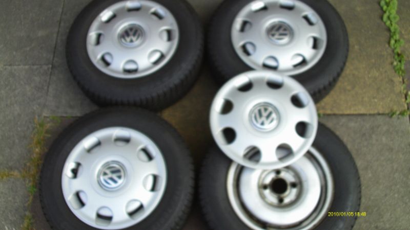 4x 13"Stahlfelge mit VW Lupo Radkappen. Winterreifen (175/70 R13) sind alt und müssten erneuert werden.